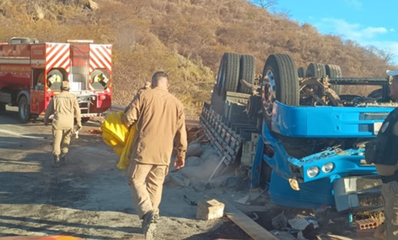 Caminhão carregado de cimento e tijolos tomba e deixa duas vítimas fatais na Serra do Teixeira